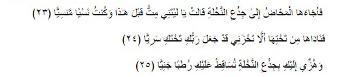 “پھر زچگی کی تکلیف نے اْسے ایک کھْجور کے درخت کے نیچے پہنچا دیا وہ کہنے لگی ” کاش میں اس سے پہلے ہی مر جاتی اور میرا نام و نشان نہ رہتا”(۳۲)فرشتے نے پائنتی سے اس کو پکار کر کہا “غم نہ کر تیرے رب نے تیرے نیچے ایک چشمہ رواں کر دیا ہے (۴۲)اور تو ذرا اِس درخت کے تنے کو ہلا، تیرے اوپر تر و تازہ کھجوریں ٹپک پڑیں گی(۵۲)”